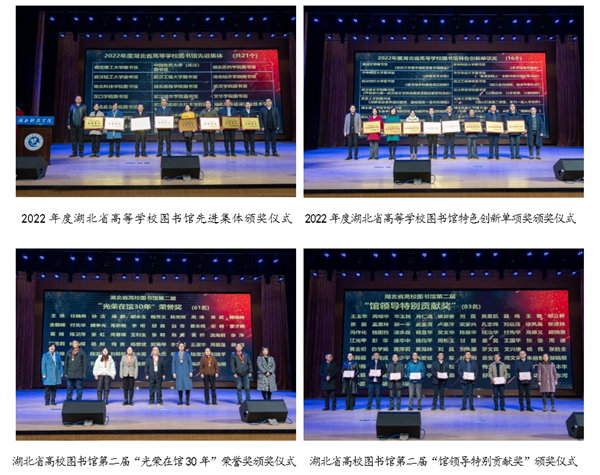 会议期间还专门颁发了2022年度湖北省高等学校图书馆先进集体和特色创新单项奖、2022年度湖北省高等学校图书馆先进工作者、湖北省高等学校图书馆第二届“光荣在馆30年荣誉奖”、湖北省高等学校图书馆第二届“馆领导特别贡献奖”等奖项。同时还举行了湖北省高等学校图书馆第三届、第四届“馆员风采”大赛部分优秀作品展演。